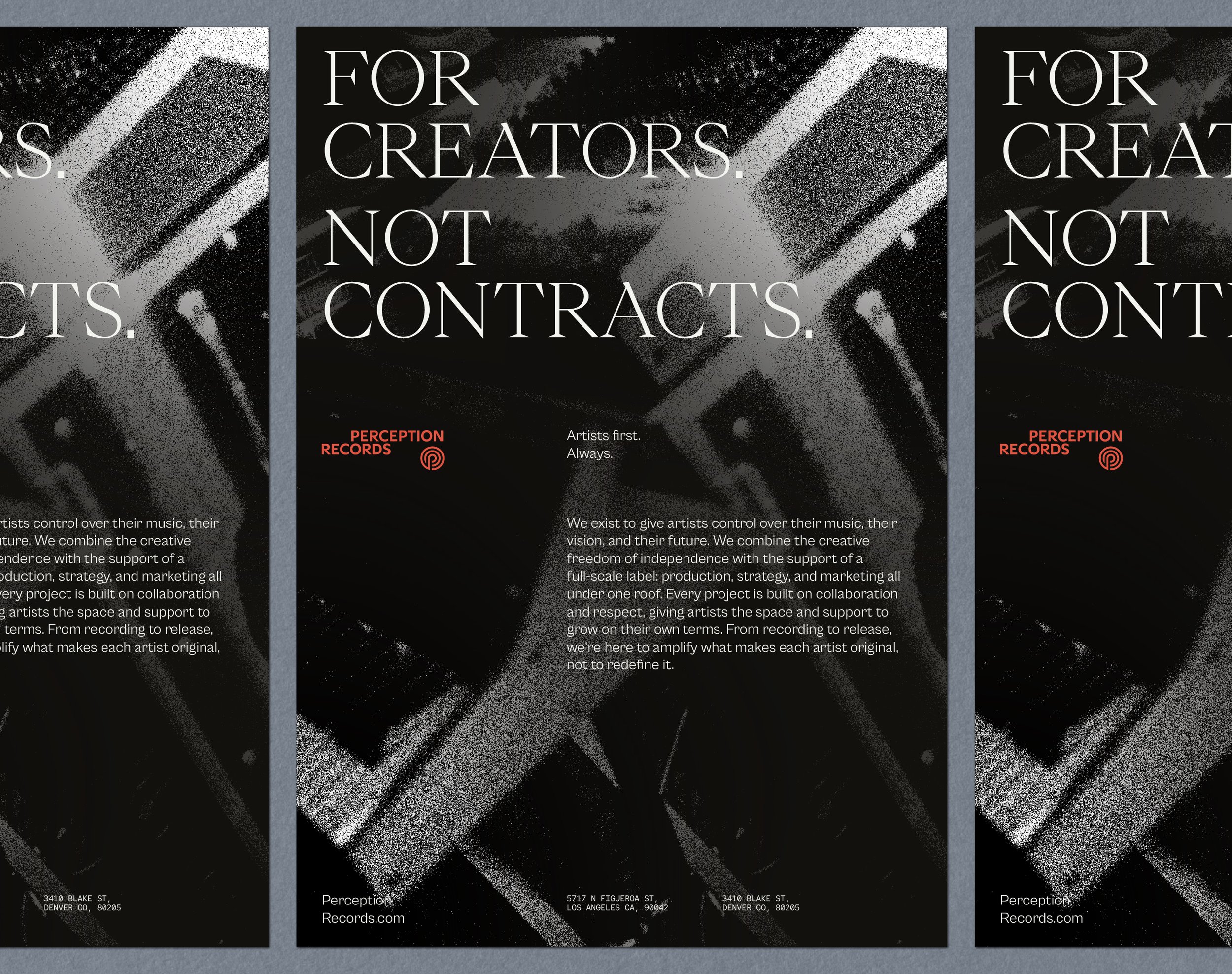 My work with Perception focused on elevating the existing visual identity rather than replacing it. The goal was to refine what was already working, improve execution and functionality, and ensure the brand could flex quietly across a wide range of artist campaigns without competing for attention. The focus was on clarity, restraint, and adaptability, ensuring the brand could operate confidently across a wide range of artist-led projects while remaining true to Perception’s values of ownership, independence, and integrity.