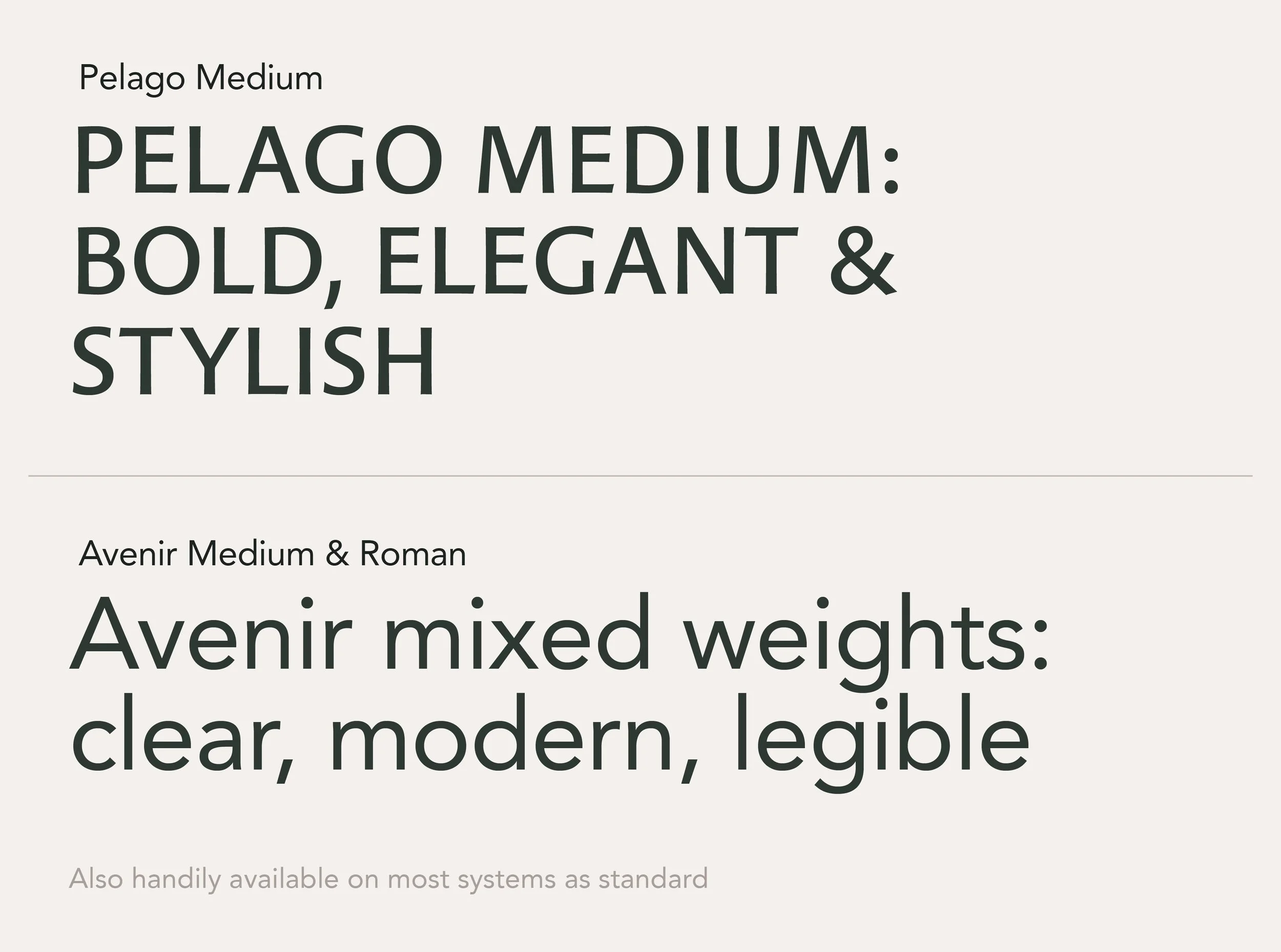 When pairing the mark with a typeface, I knew I wanted to land somewhere in, what I call, the semi-serif space. Which, if you’re not immediately on board with my description, is a typeface that takes elements from both serifs and sans-serifs to create a luxe but modern style. For example, taking the thicks and thins ratio from a serif typeface and lopping off the serifs. This would be perfect for Sylvarna - allowing the identity to nod to heritage whilst keeping a firm eye on the future. To compliment Pelago, I chose Avenir. With its clean lines and balanced proportions, it ensures optimal readability whilst reflecting Sylvarna’s commitment to clarity and professionalism. A bonus point for Avenir is that it’s available on most systems as standard so there shouldn’t be any issues viewing documents from machine to machine.